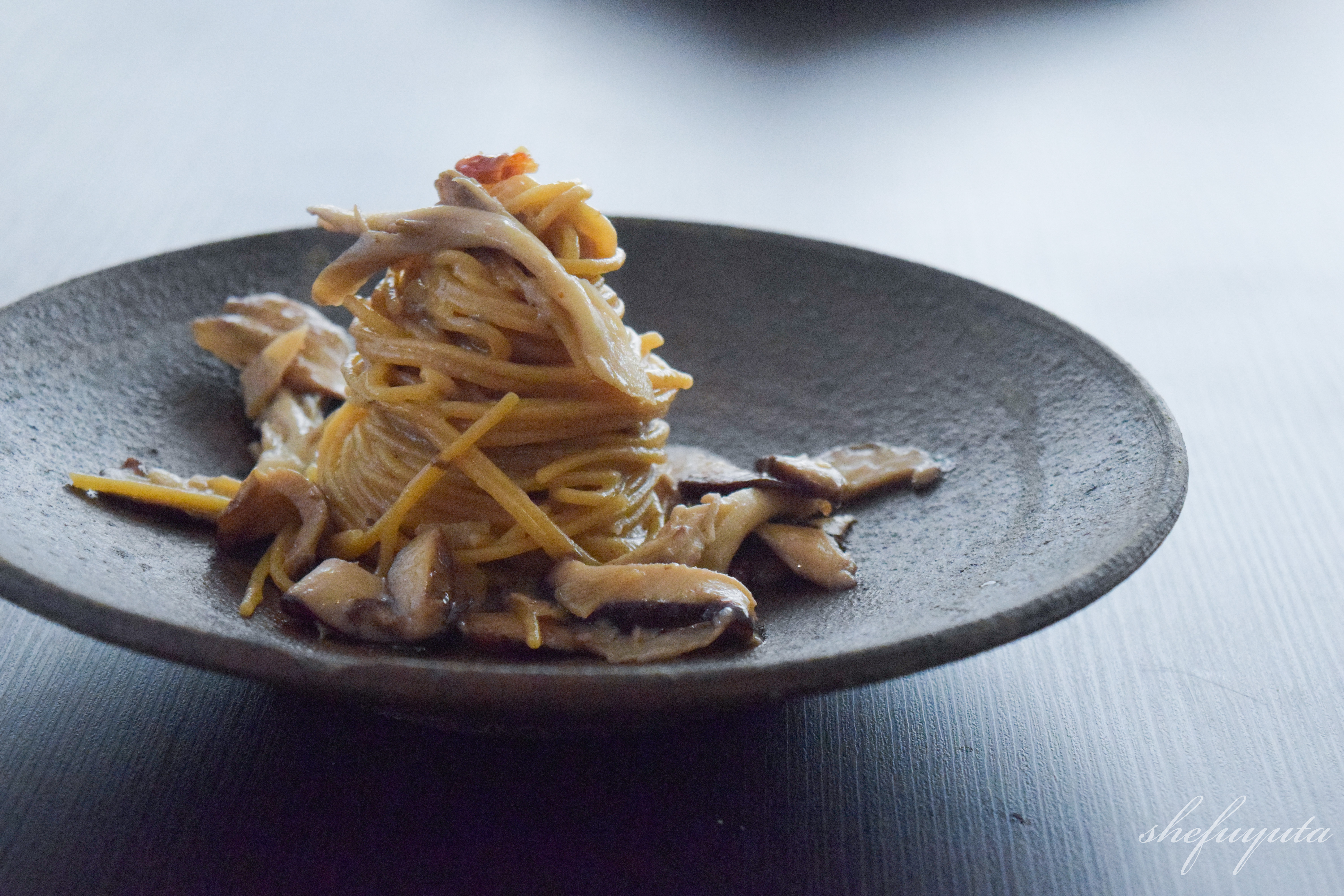 キノコの水分が飛んで小さくなりちょっと焦げ目が付くくらいのタイミングでパスタが茹で上がるのがベスト。